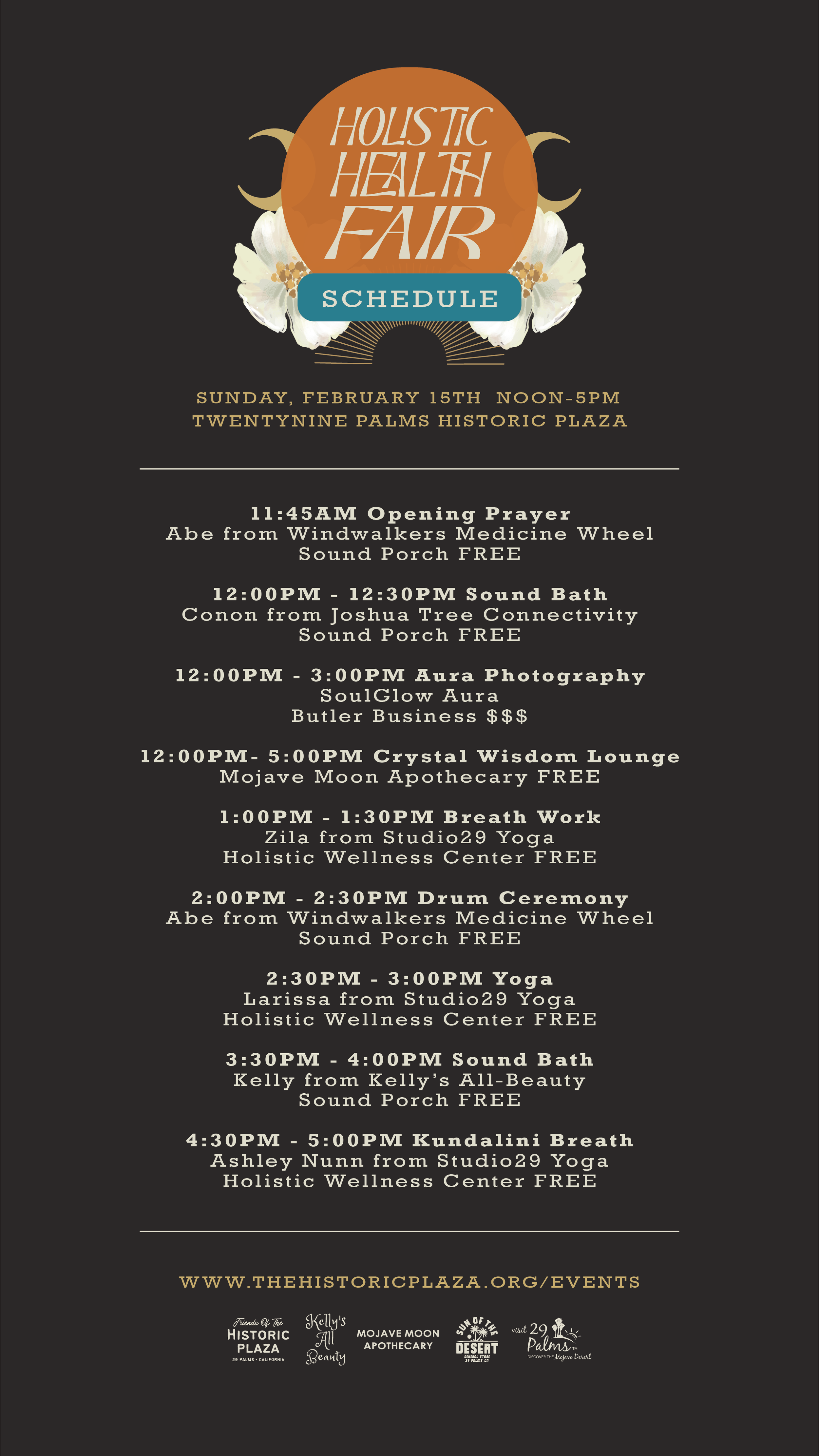 Friends of the Historic Plaza, in partnership with Kelly’s All-Beauty, is excited to announce the Holistic Health Fair, a new outdoor wellness-focused event celebrating mindful living, self-care, and the restorative qualities of the desert. The Fair will feature holistic practitioners, wellness educators, movement and meditation offerings, healing arts, and a curated marketplace highlighting natural wellness goods and intentional lifestyle products. Entry is free for all, kid + pet friendly, and all are welcome!
